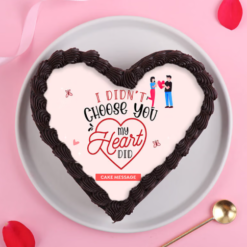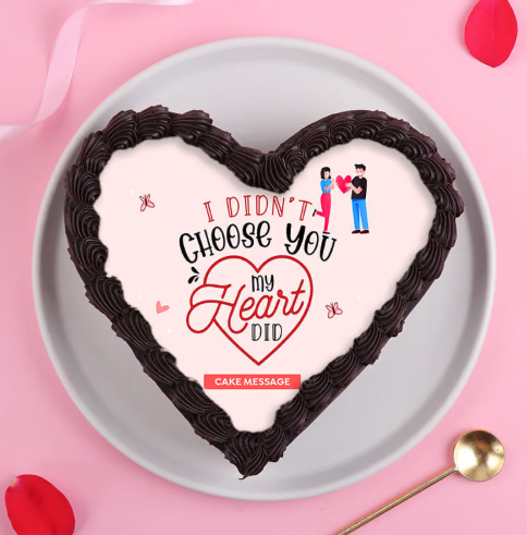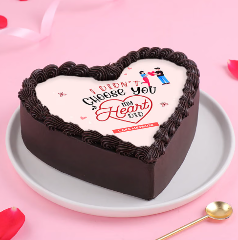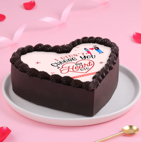 This heart-shaped chocolate photo cake features a glossy edible print framed with rich chocolate piping and smooth cream layers. With its soft chocolate sponge and romantic design, it’s a perfect choice for Valentine’s Day surprises, love confessions, and heartfelt celebrations.