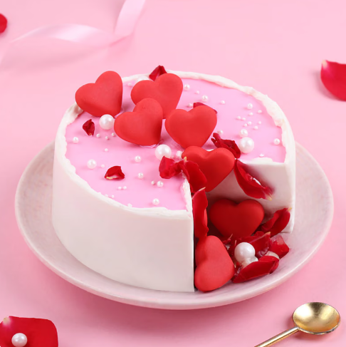 This beauty is adorned with soft, edible pearls and rose petals that spill from the centre, evoking a sense of love, passion, and joy. Each bite delivers the rich, velvety taste of chocolate, which perfectly balances the light, floral essence from the delicate decorations. A wonderful choice for sharing intimate moments with your partner, whether it’s for Valentine’s Day.