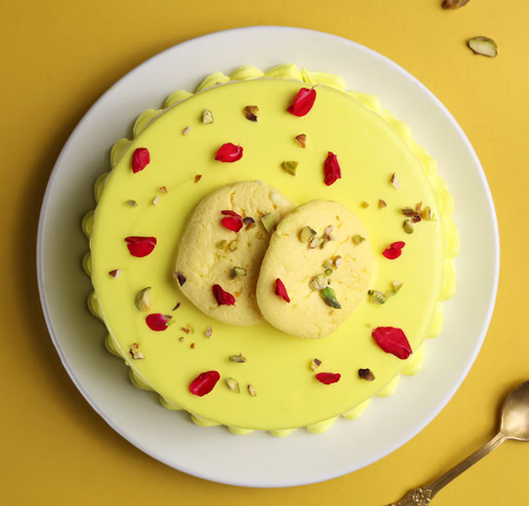 • Soft vanilla sponge soaked in rasmalai-flavoured milk