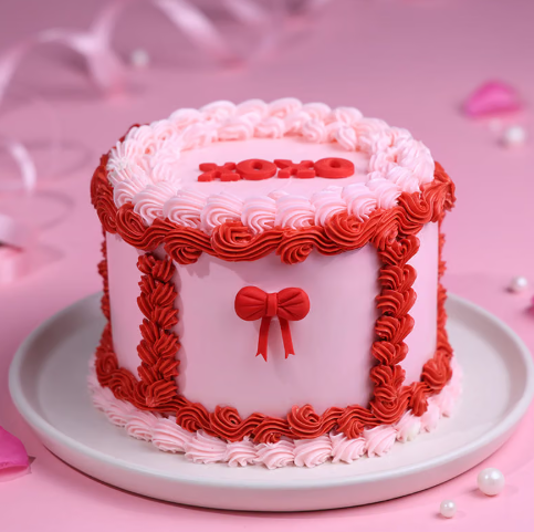 Description Indulge in the rich layers of this moist chocolate cake, crafted to perfection. Topped with vibrant red and pink cream decorations, it is elegantly decorated with a charming bow detail, adding a touch of romance. The fresh frosting beautifully complements the decadent chocolate layers, making each bite a delightful experience. Perfect for Valentine’s Day.